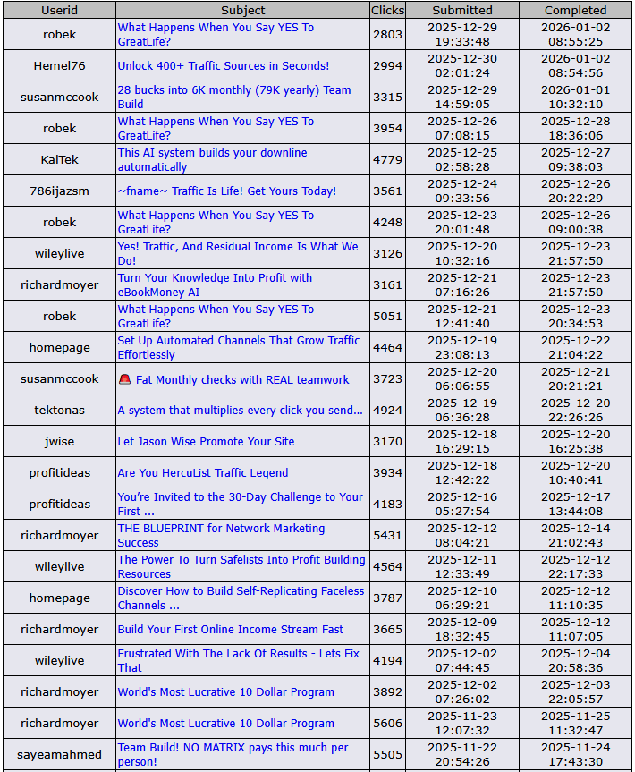 | Guaranteed Solo Ad Clicks From 300-500 Traffic Sites Over 15 Million Solo Ad Clicks Delivered from SoloAdWarehouse.com Limited Time Get Your Orders DOUBLED! PLEASE ONLY SUBMIT 1 AD PER WEEK! ![]() We Manually Submit Your Solo Ads To 300 to 500 Mailing Sites Your Ads Get A MINIMUM Of 2,500 Guaranteed Clicks Within 3 To 7 Days Here Are The Results Of Some Of Our Most Recent Customers: BONUS Ads from MasterSafelistBlaster.com ![]()
